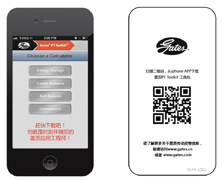了使客户更方便的设计传动系统,盖茨推出了PT Toolkit设计工具包(目前适用于苹果iOS的操作系统)。